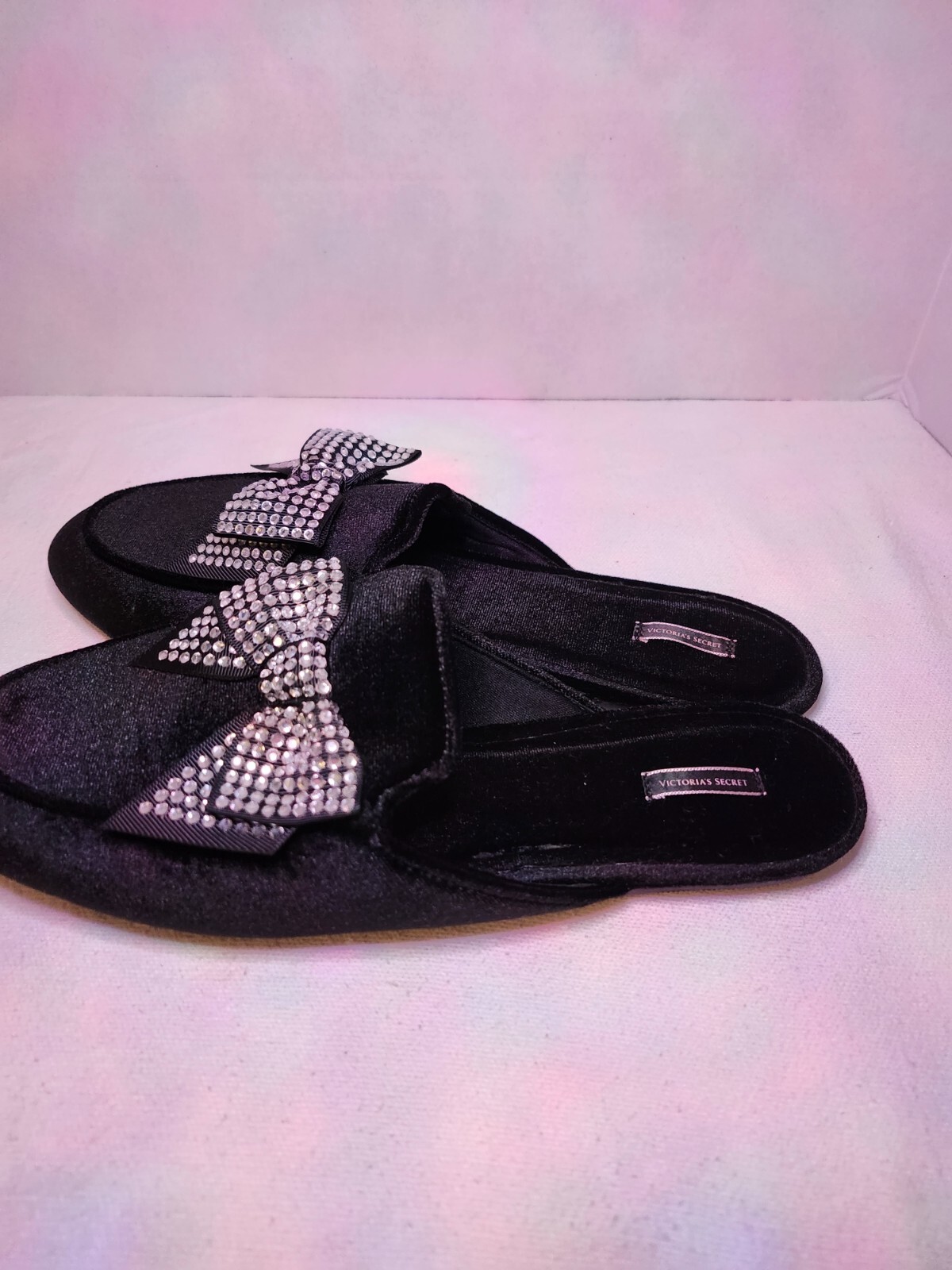 These Victoria's Secret black velvet mule slippers with rhinestone bows are a luxurious and stylish addition to any woman's wardrobe. The slip-on design and flat heel make them comfortable for lounging at home, while the rhinestone accents add a touch of glamour. The velvet fabric and polyester lining provide a soft and cozy feel, while the rubber outsole ensures durability. Perfect for relaxing in style, these slippers are a must-have for any fashion-forward woman.
