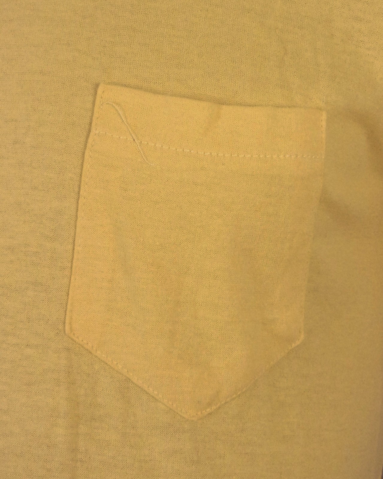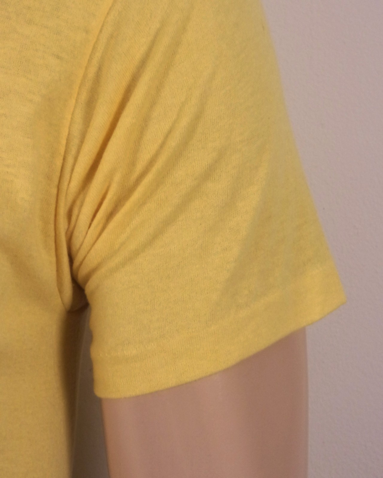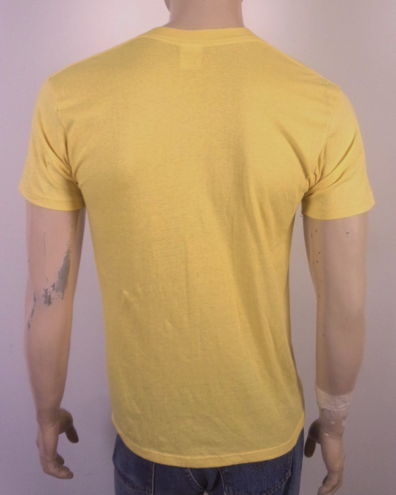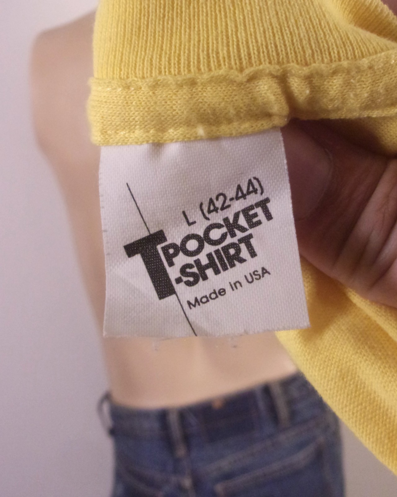 The vintage 70s 80s single stitch Pocket T-Shirt in solid yellow is a soft, thin punk rock staple made from a cotton blend material. With a classic crew neck and short sleeves, this regular fit T-shirt features a graphic print that embodies the USA, 70s, and 80s themes. Machine washable and made in the United States between 1980-1989, this T-shirt in size L offers a unique and nostalgic style perfect for any season. Looks awesome! True vintage old single stitch in great shape overall, has just a small area of speck blemishes near the bottom front.