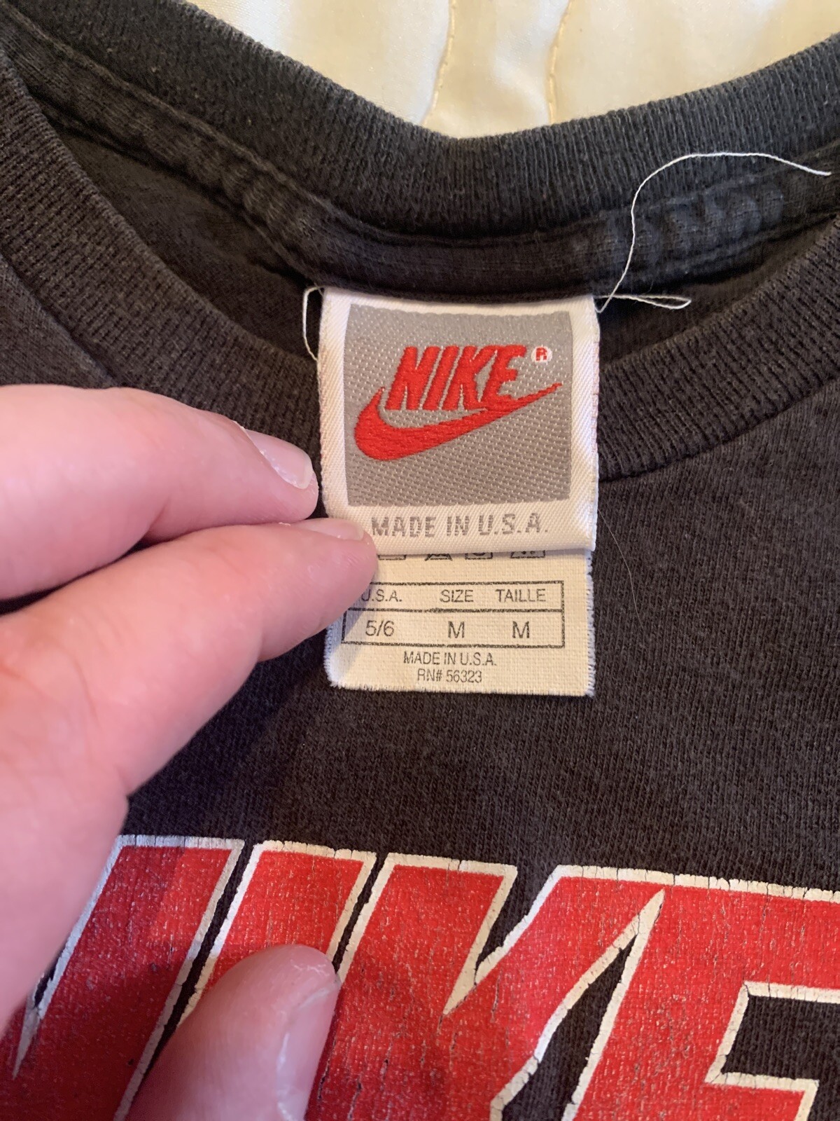 This vintage 80s 90s Nike Gray Tag T-Shirt features a spell out Swoosh logo on the front, showcasing the iconic Nike Air theme from the USA. The black cotton t-shirt with a crew neck and short sleeves is perfect for traveling, activewear, and casual occasions. Made in the United States, this regular fit t-shirt in size M is machine washable and embodies the retro style of the 80s and 90s era, making it a unique addition to any boy's wardrobe. Measurements: Pit to Pit: 1 3 Sleeves: — Total Length: 1 7.5