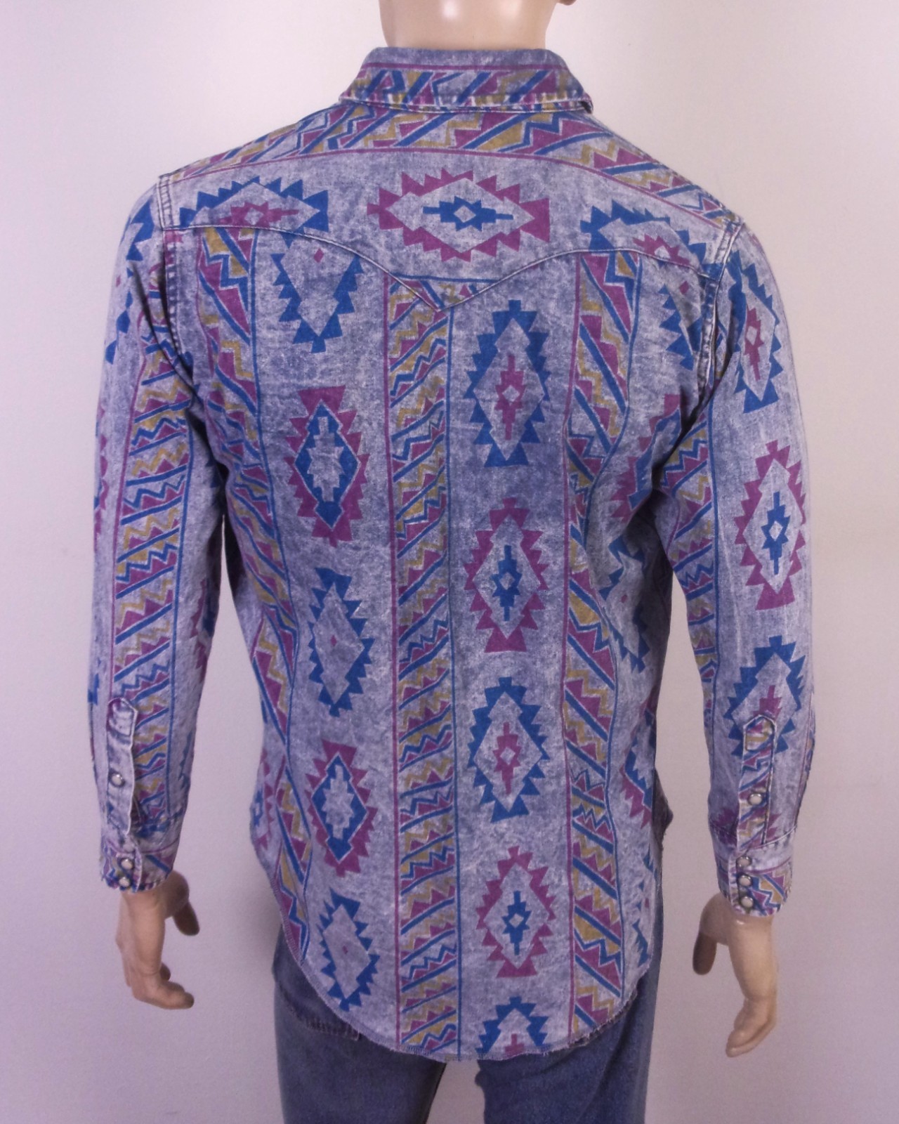 The product is a vintage 80s 90s Wrangler RARE Acid Wash Denim Southwestern Shirt with a unique Southwestern print over acid wash denim. This long sleeve shirt features a snap closure, collared neckline, and is machine washable. The multicolor shirt is made of cotton denim and has a regular fit, perfect for casual, workwear, party/cocktail, or travel occasions. With a Western cowboy theme, this shirt is a rare find from the United States, ideal for winter, fall, and spring seasons. Looks amazing! Beautiful bold southwestern pattern over acid wash denim. Not chambray, actual acid wash all cotton denim - I've never seen this specific one. USA made classic in great shape too! Pit to Pit: 22 Sleeves: 23 Length: 30 Shoulders: 17.25