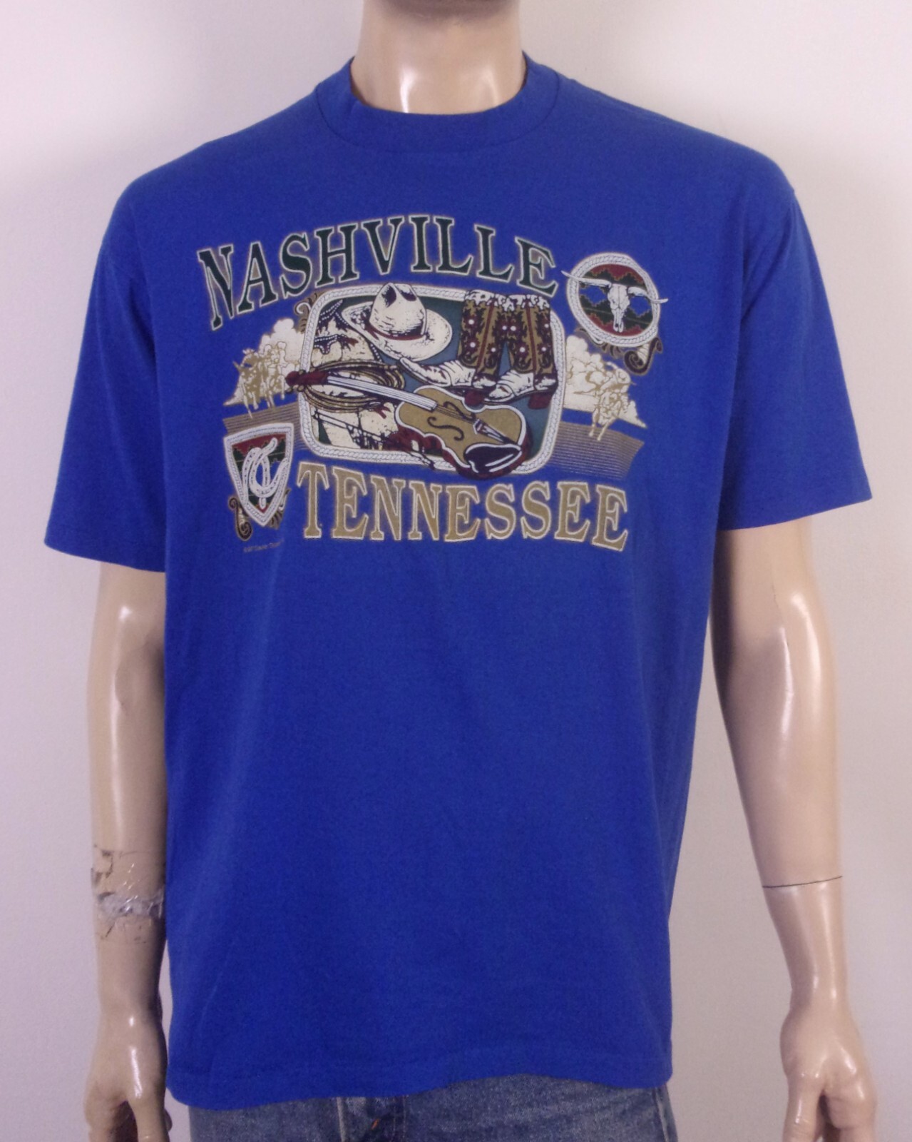 This vintage T-shirt from the 80s-90s features a graphic print of Nashville, Tennessee, with cowboy imagery on a blue cotton blend fabric. It is a size XL with short sleeves and a crew neck. The shirt is machine washable and has a regular fit. Made in the United States, it showcases single stitch detailing and is a nostalgic piece reflecting 80s and 90s fashion trends. Looks awesome! True vintage single stitch tee in great shape, features slightly raised graphics.
