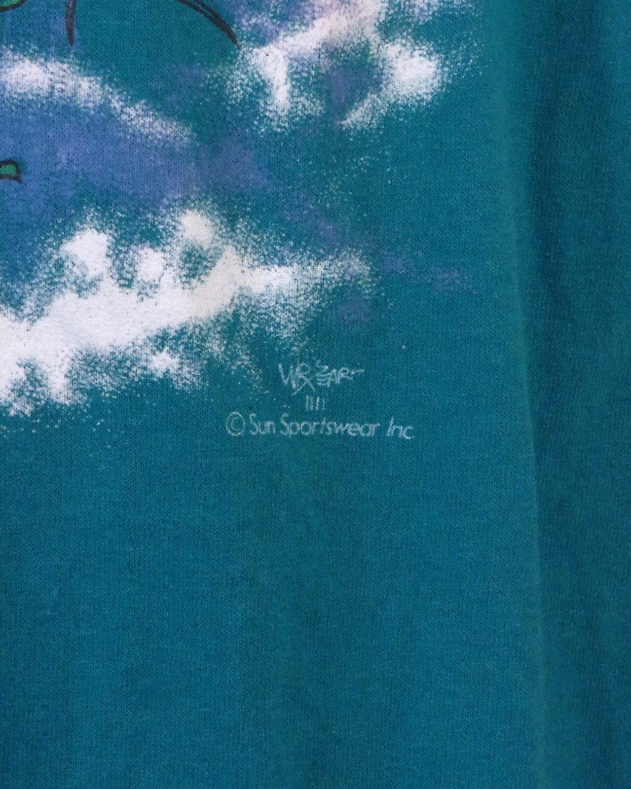 This vintage 80s T-shirt in size XL features a teal color with a graphic print of a windsurfing design. Made of a cotton/polyester blend, it has a crew neck and short sleeves. The single stitch construction indicates its age, and it is from the brand Sun. The shirt embodies a retro surf and beach theme, perfect for those who love windsurfing and the 80s era. Beautiful true vintage surf tee/windsurfing theme tee, single stitch with soft and thin fabric. Great shape throughout!