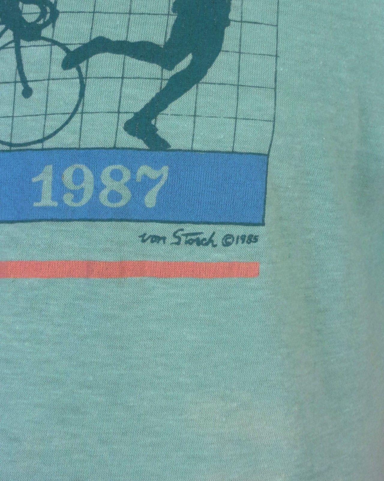 The vintage 1987 Seaside Triathlon T-Shirt Napoli Garden in size L is a graphic print shirt with a crew neck and short sleeves. Made from a cotton blend material, this thin and soft shirt is machine washable and features a light pale blue/green color. Perfect for any season, this unique tee captures the 80s vibe with its distressed look and triathlon theme from the 1987 Napoli Gardens Seaside Triathlon. The regular fit and size make it a great addition to any man's wardrobe, representing a piece of history from the United States. Beautiful true vintage single stitch tee, distressed and worn but with no dealbreaking flaws that are eye sores. It has a small little sleeve seam split, very tiny, see pics. Aside from that considering the heavily worn/thin/distressed nature of the fabric, it has pretty minimal specific flaws.