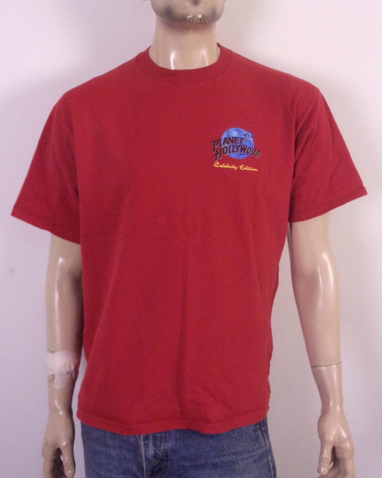 Embrace the nostalgia with this classic vintage Planet Hollywood T-Shirt, featuring iconic artwork of Sylvester Stallone from the 1991 film 'Hercules O'Clock'. This red, short-sleeved tee is a testament to 90s fashion, made from comfortable cotton material that's easy to care for and perfect for all seasons. Crafted in the United States, the shirt comes in a size XL with a regular fit that's great for a relaxed look. The crew neck design and solid color make it a versatile addition to any wardrobe, while its single-stitch construction and celebrity edition theme make it a unique find for collectors and fans alike. Looks awesome - has a couple of small surface holes toward the bottom but overall pretty solid shape.