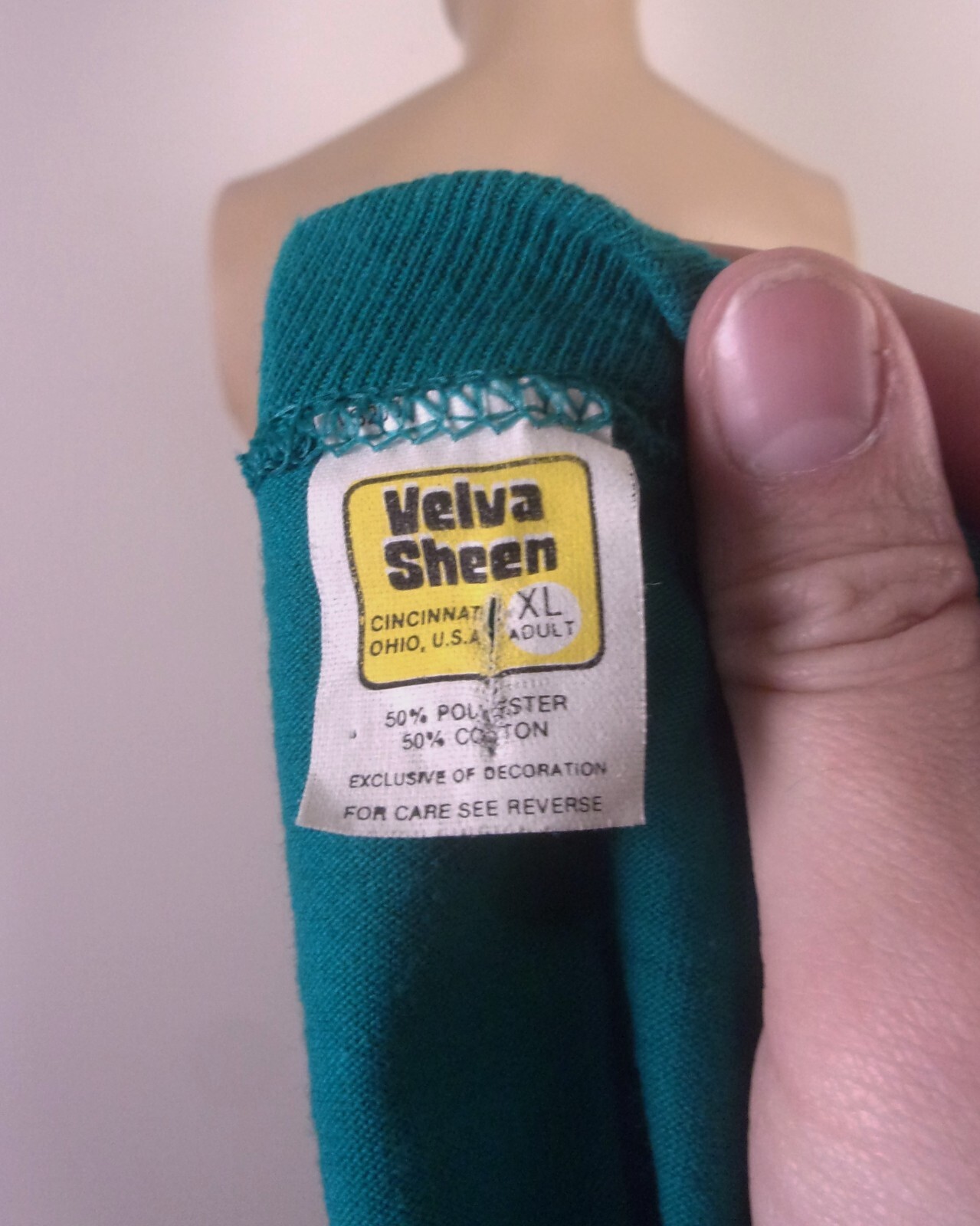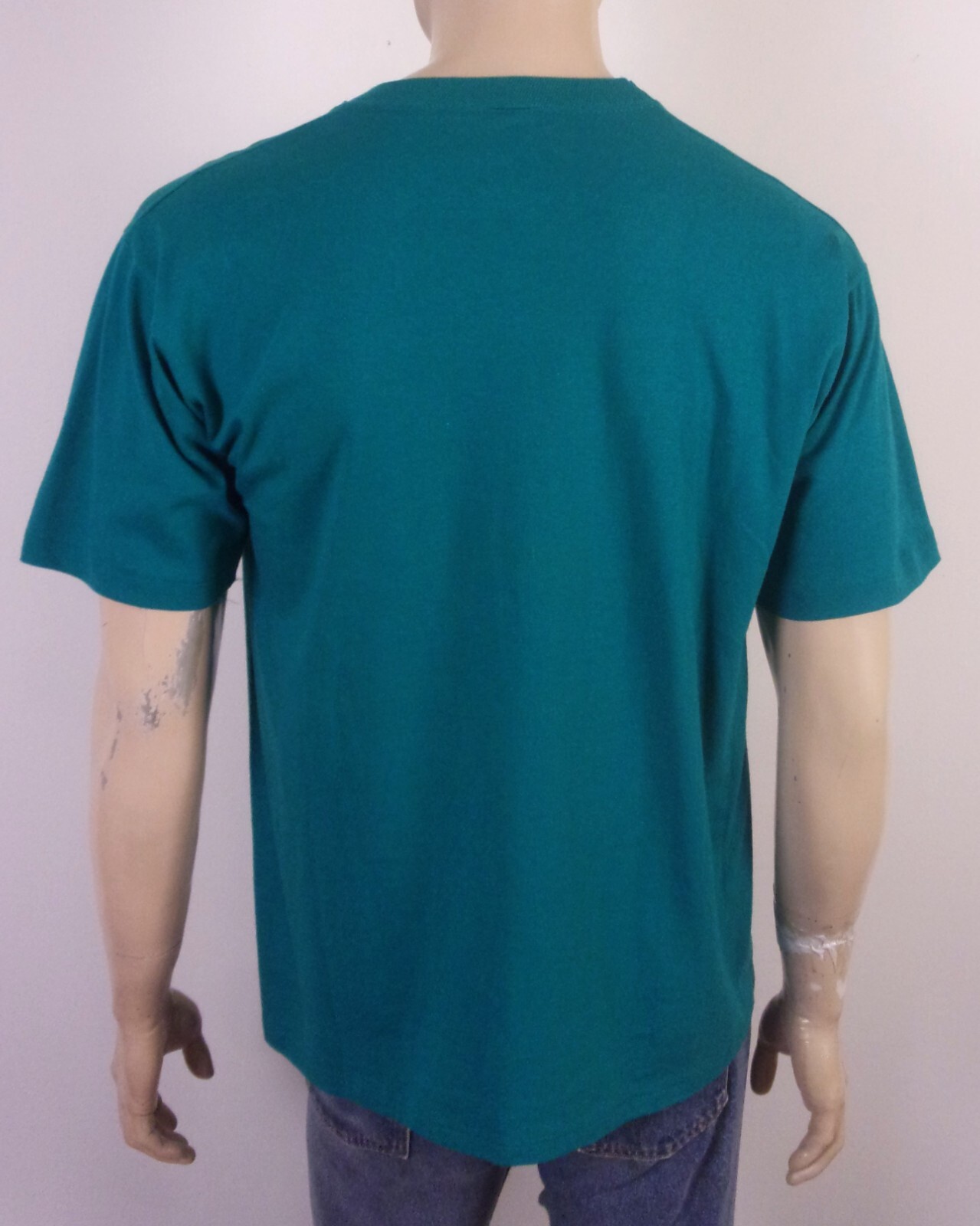 This vintage 90s Velva Sheen T-Shirt features a graphic print of Palm Trees with glitter details on a green teal cotton blend fabric. It has a crew neck, short sleeves, and a regular fit in size XL. Made in the United States, this single stitch shirt is a nod to the 80s and 90s era, perfect for adding a retro touch to any outfit. Beautiful! True vintage single stitch in amazing shape with no flaws.
