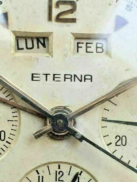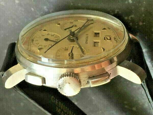 seltener historisch wertvolle Eterna Dato-Compax, Vollkalender-Chronograph mit dem Manufacturkaliber ETA/Valjoux 72C , wie es auch von PRolex, Pateks, ABreguet, Jaegers und anderen großen Namen in der Branche verwendet wurde. Das Werk hat gerade Wartung von unserem Spitzenuhrmacher bekommen. schönes Original-Zifferblatt Gehäusedurchmesser ohne Krone sind die für die Nachkriegszeit üblichen 35 mm Lederarmband von 23 cm Länge voll versicherte Lieferung Listing and template services provided by inkFrog