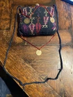 vintage Middle Eastern hand embroidered PERFUME scent BAG textile, with beaded coin like detail, 4 1/2” x 4 1/2”, has some wear but good condition.