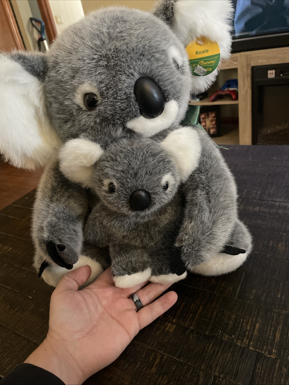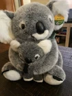 The vintage Uniring Australia Koala soft plush toy with a baby koala is a charming small stuffed animal featuring the brand Koala Baby. Made in Australia, this gray-colored toy portrays a koala mother with her baby. Perfect for collectors or children who love adorable stuffed animals, this plush toy captures the essence of Australian wildlife in a cuddly and huggable form. Brand new