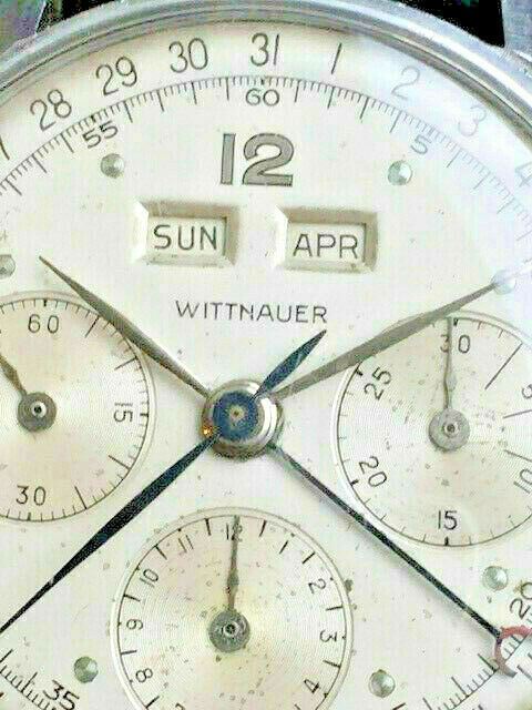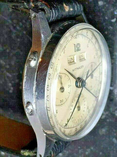 rare historically valuable Wittnauer (today Longines) Valjoux 72 triple calendar chronograph in a stainless steel case case diameter without the crown 35 mm all original dial on silver base inside works the high grade Valjoux 72 C movement, full working it comes with a dark leather strap of 22 cm shipping with full insurance Listing and template services provided by inkFrog