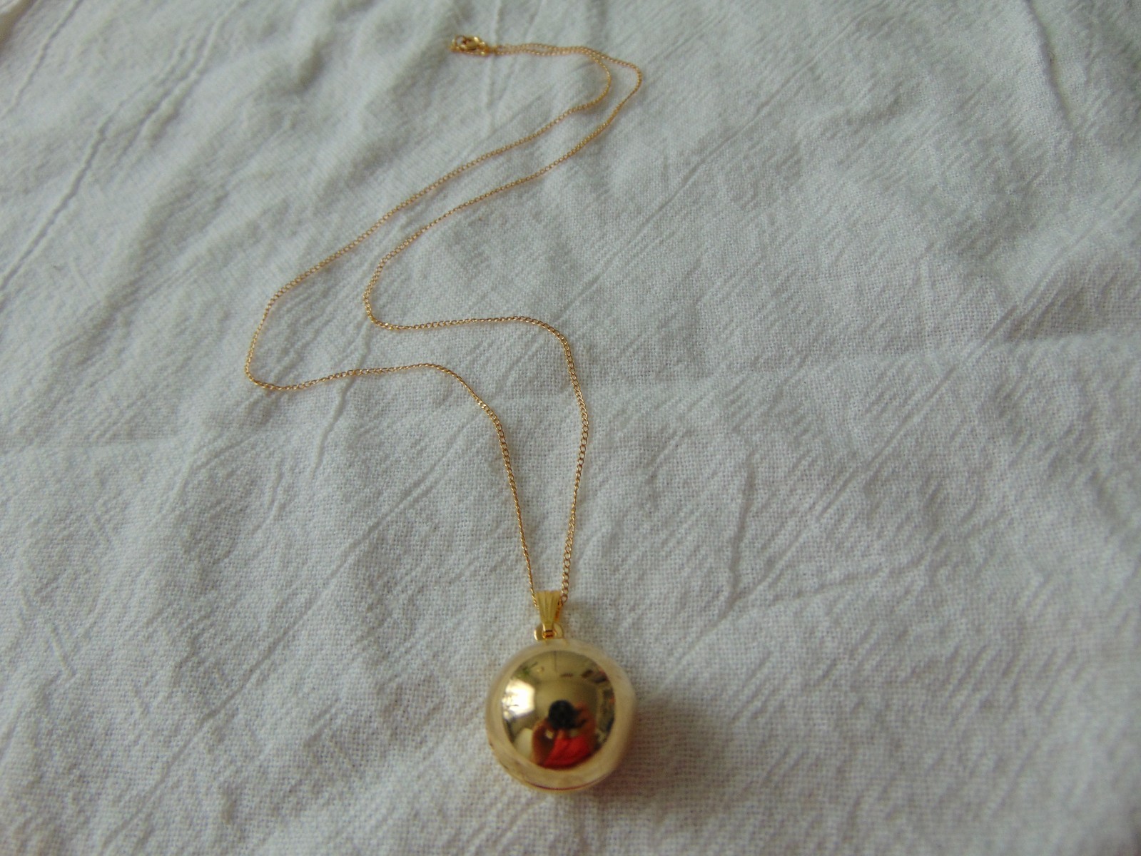 18 inches long gold filled chain with an 1 inch long ball locket. locket opens up and can hold 2 photos, stays closed excellent. very collectible. marked gold filled on clasp of chain necklace. locket is gold plated.