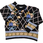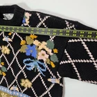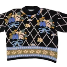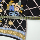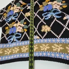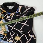 30% wool 70% acrylic crochet knit sweater with diamonds flowers and bows. there is shoulder pads if needed can be cut out. vintage sweater is in excellent clean condition soft and comfy Sz medium measures flat 23" across shoulders 22" pit to pit 21" length 16" sleeves