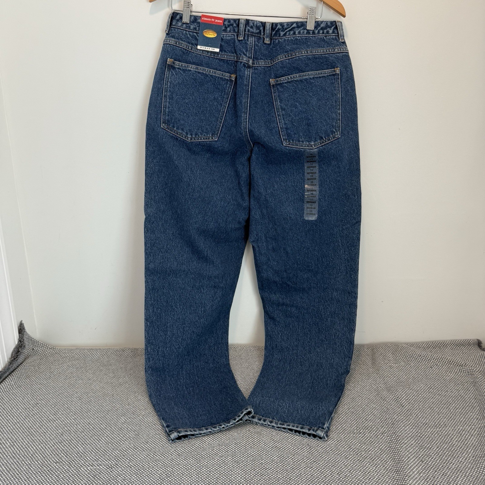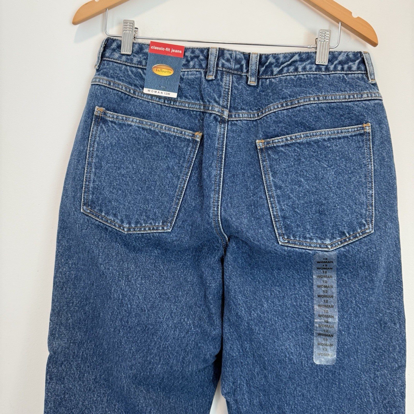 These vintage Talbots classic-fit jeans in size 12W are a brand new pair with a solid blue color and a mid-rise fit. Made from a blend of spandex, cotton, and a cotton blend denim fabric, these jeans feature a zip closure, 5-pocket design, and straight style. With a nod to the 90s theme, these lightweight jeans are versatile for all seasons and are perfect for a classic, timeless look. The Talbots brand ensures quality and style for any woman's wardrobe.