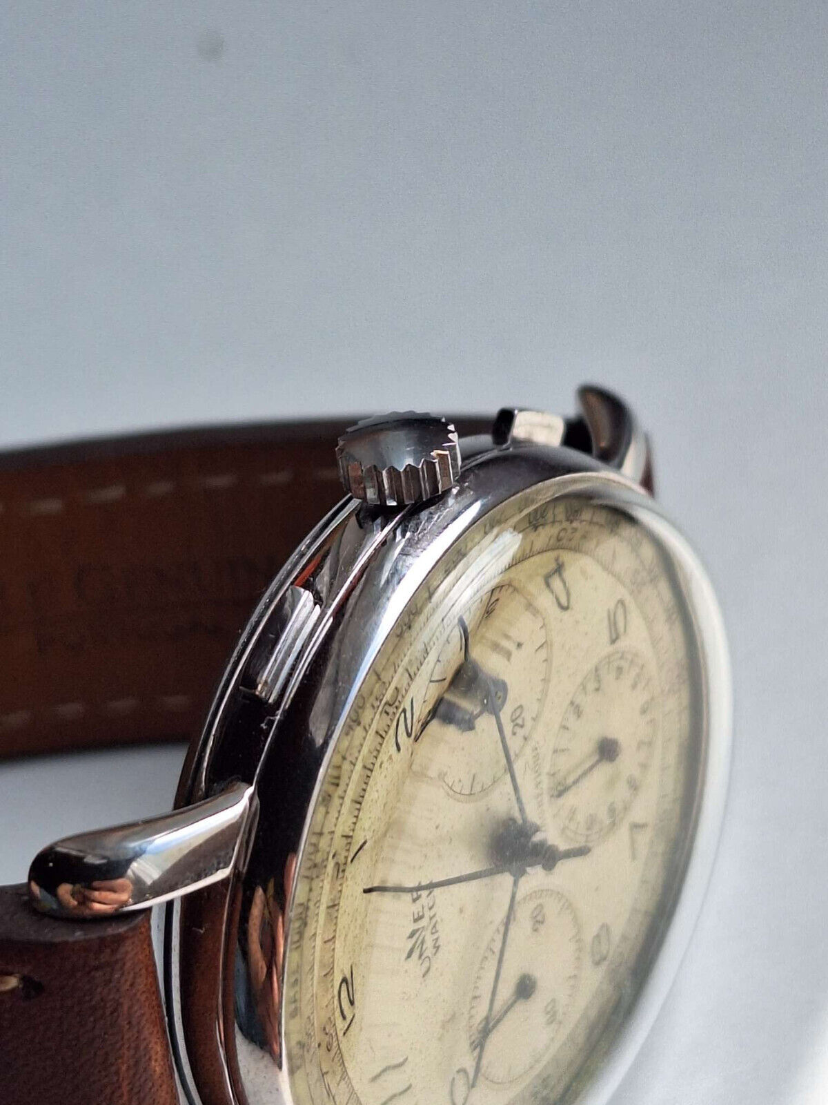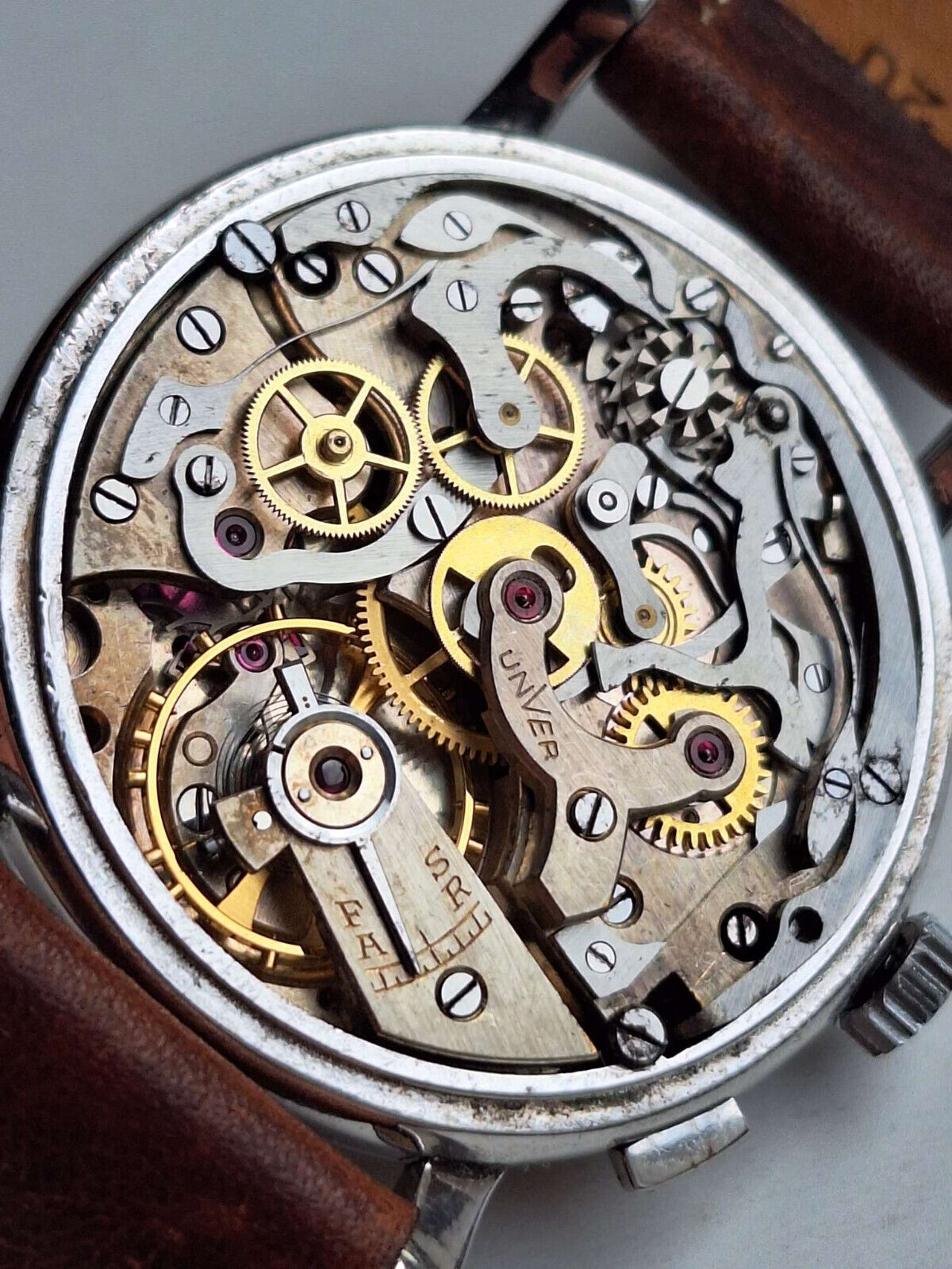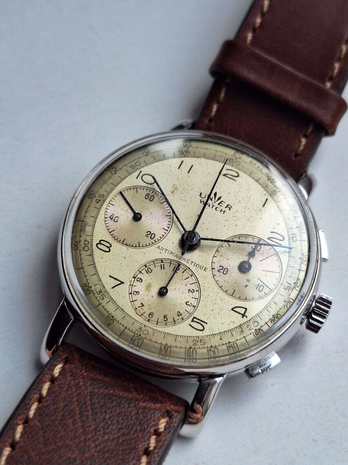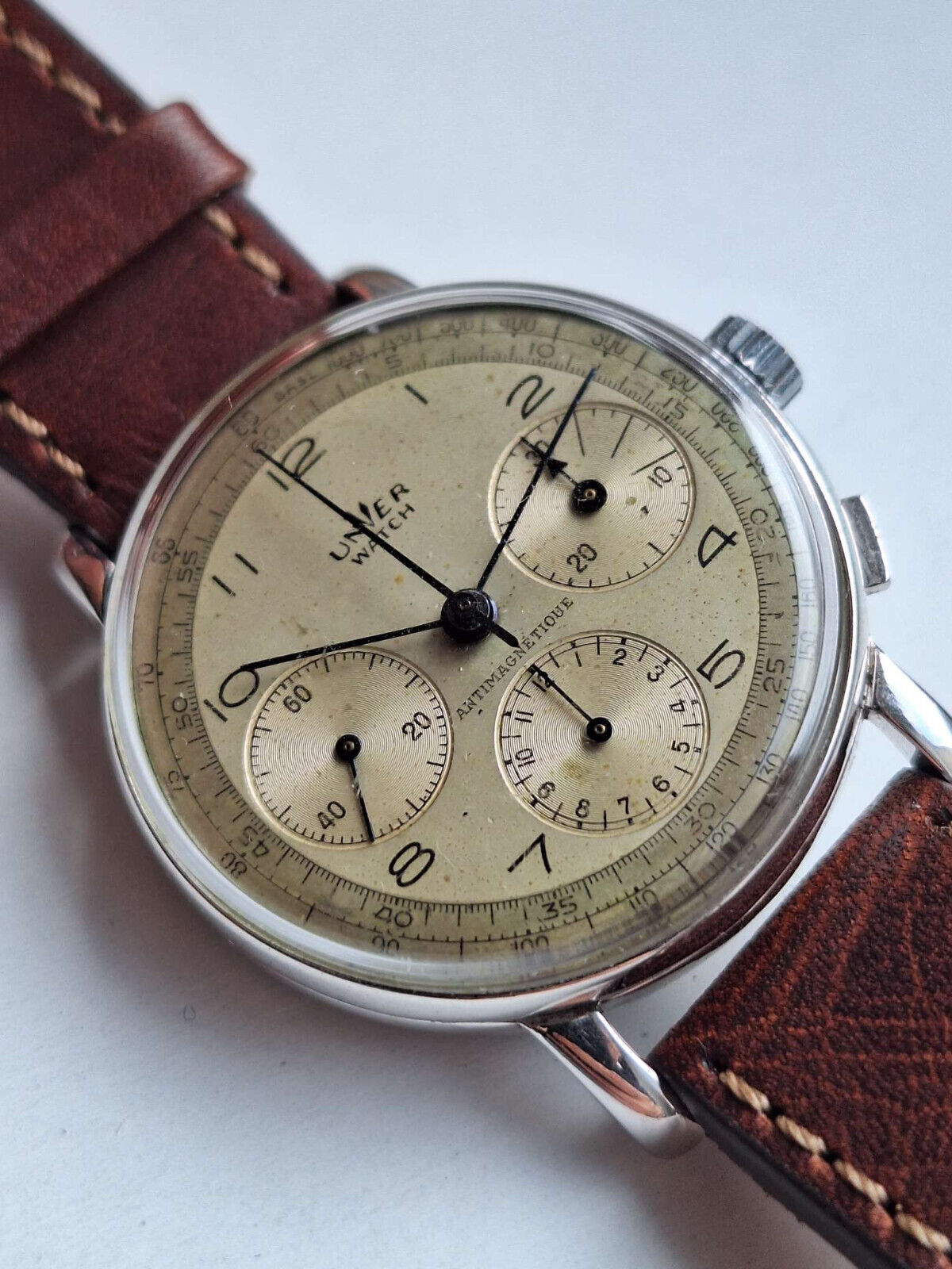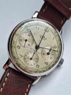 a very rare and all original vintage Unver Valjoux 71 chronograph in a stainless steel case, 36,5 mm case diameter without the crown all original dial on silver base inside working is the high grade Valjoux 71 movement with column wheel, full working - time, start, stop, reset to 12.00, just serviced by our master watchmaker the watch comes with a new leather rally strap 22,5 cm long extremly rare Dreamwatch Listing and template services provided by inkFrog