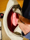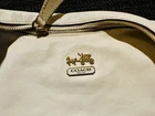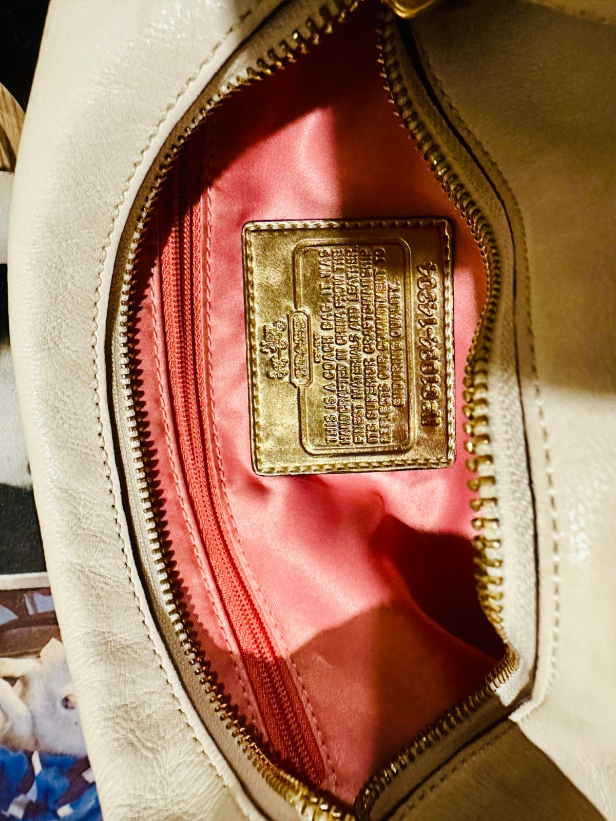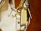 The product is a white Coach women's large crossbody leather handbag from the Coach Classic product line. It features a rectangular shape with a solid exterior color, white leather material, and gold hardware accents. The handbag has a zip closure, medium size, and a fabric lining with a pink color. The white handle/strap adds a classic touch to the designer bag, making it suitable for casual occasions. The bag is from the Coach Classic model, combining style and functionality for everyday use.