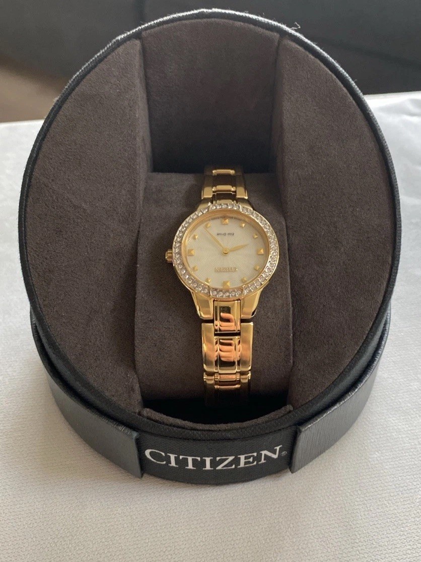 This preowned women's Citizen Eco-Drive watch features a stylish design with a gold bezel and bracelet, complementing the elegant mother of pearl dial with stick indexes. With a sleek silver case and a water resistance of 100m, this quartz movement wristwatch is perfect for everyday wear. Made in Japan, this timepiece comes with its original box and papers, making it a beautiful addition to any collection.