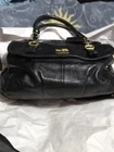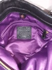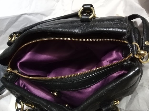 The product is a Coach women's handbag made of black leather with a purple satin interior. It features a medium size shoulder bag style with a zip and dual magnetic closure, metal hardware accents, and a buckle accent. The lining is satin with inner pockets, multi-compartments, adding functionality and style to the handbag. The combination of black leather exterior, purple satin lining, and unique accents make it a vintage yet modern accessory for any woman's wardrobe.