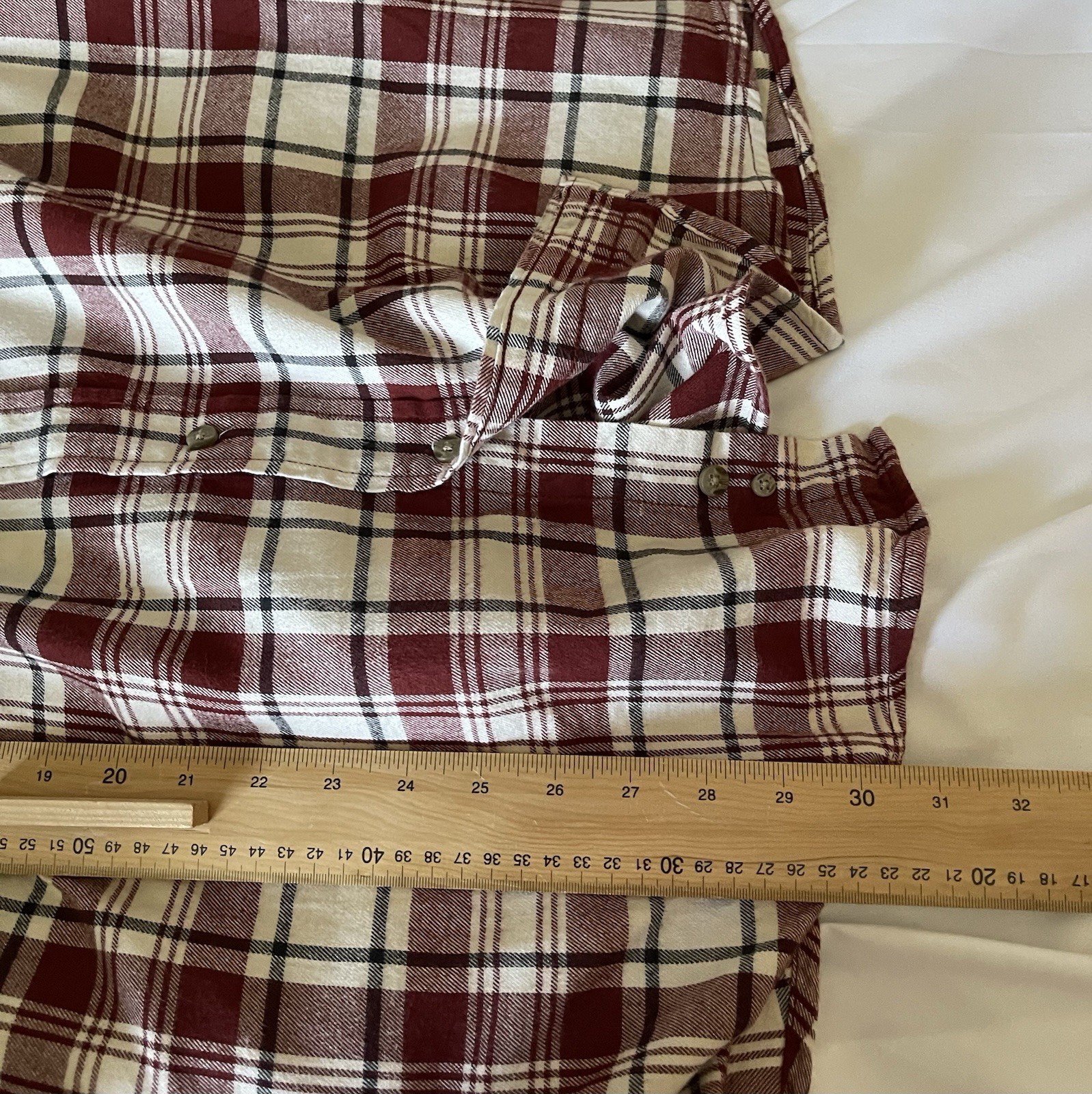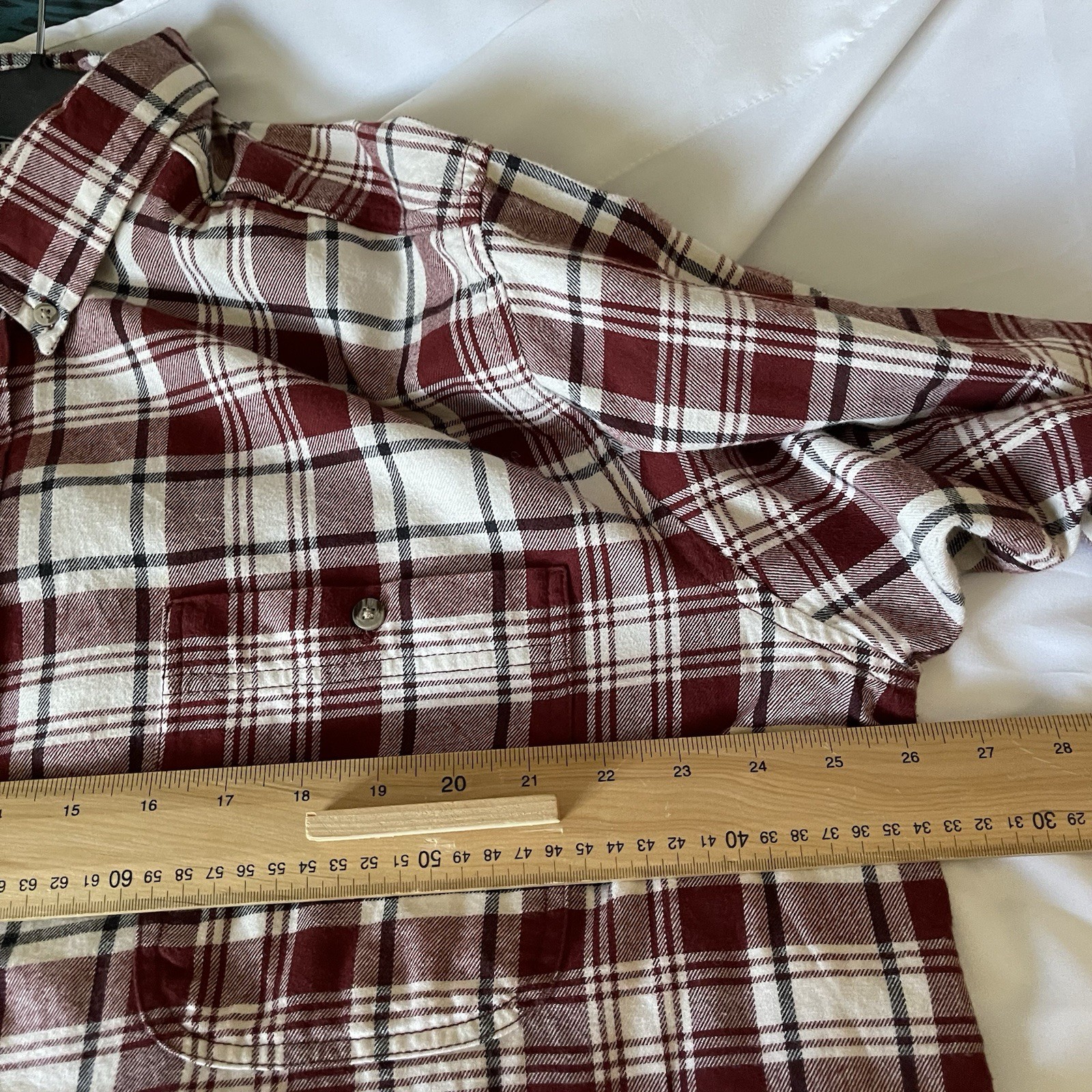 classic heavyweight flannel shirt by wrangler • line: rugged wear • colour: red, white & black plaid • size: estimated xl (please check measurements below) • material: soft brushed cotton flannel (tag not visible but consistent with 100% cotton) • features: button-down collar, twin chest pockets with button flaps, long sleeves with button cuffs • condition: good used condition – no holes or stains • measurements (laid flat): • pit to pit: approx. 26” • length: approx. 31” perfect for layering, workwear, or casual cold-weather outfits. 📦 from a smoke-free, pet-free home